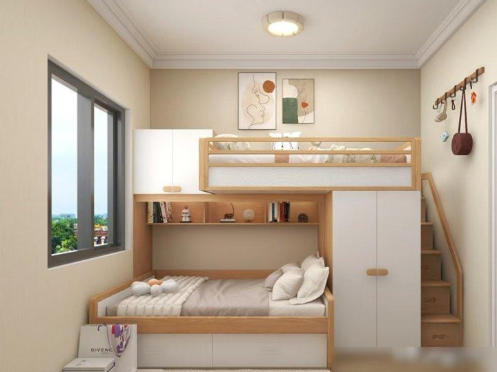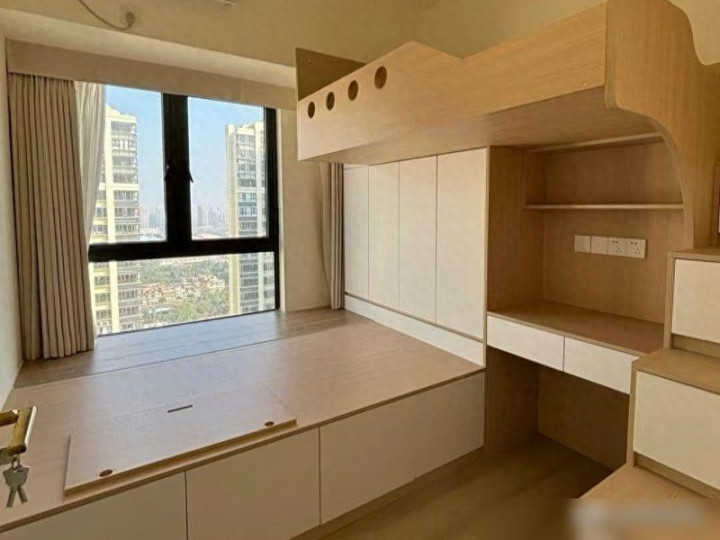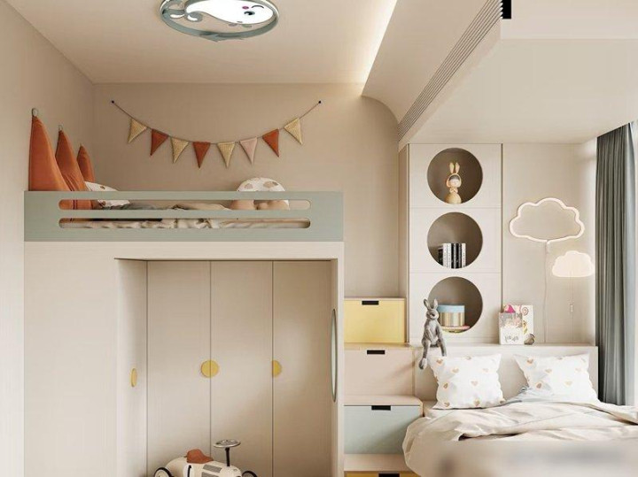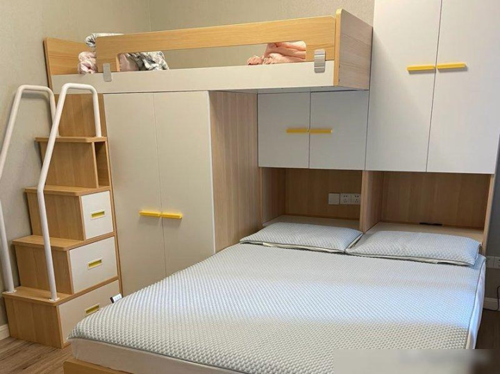 比如家里有俩娃的,试试“错位上下铺”——不是传统那种“上铺顶脑袋、下铺站不直”的上下铺,而是上铺和下铺错开大半个位置,下铺做高一点能站直,上铺调低一点不顶天花板。我邻居家俩儿子就装了这个,俩娃一人睡一边,下铺的孩子能在床底下的书桌写作业,上铺的孩子能在旁边放玩具和绘本,既能一起住有个伴,又有各自的小天地,这不比榻榻米“挤俩娃在一张床上”强?关键是床以外的空间全空着,孩子们还能在房间里跑两圈,哪像榻榻米那样“进房间就得上床”。