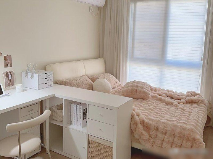 还有适合单身或小夫妻的“半包围式”设计——靠墙做张矮床,周围用书桌和收纳柜围出一个“安全感角落”,床以外的地方全空着。我同事就这么装的,她说每天晚上躺床上就能拿到旁边书架上的书,早上起来直接在书桌前敲电脑,既像卧室又像小书房,朋友来玩都说“看不出这是个小卧室”,空间利用得恰到好处,比榻榻米那种“啥都想要却啥都不好用”的设计聪明太多。